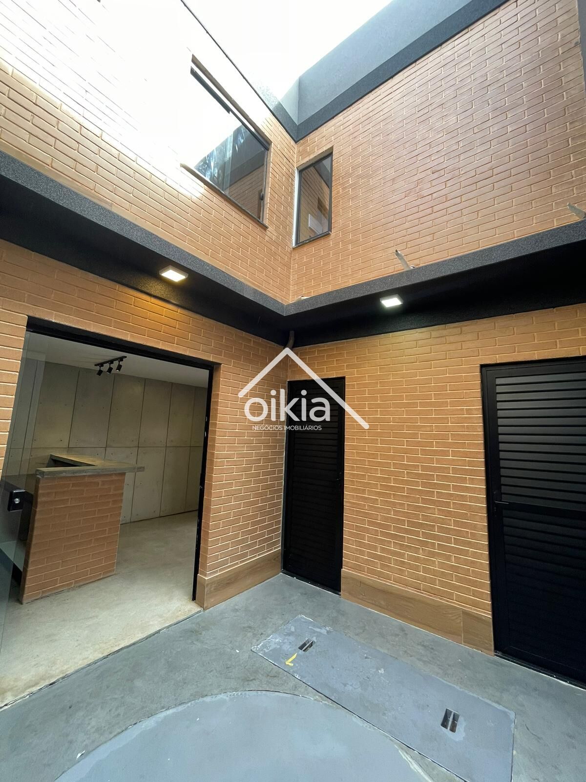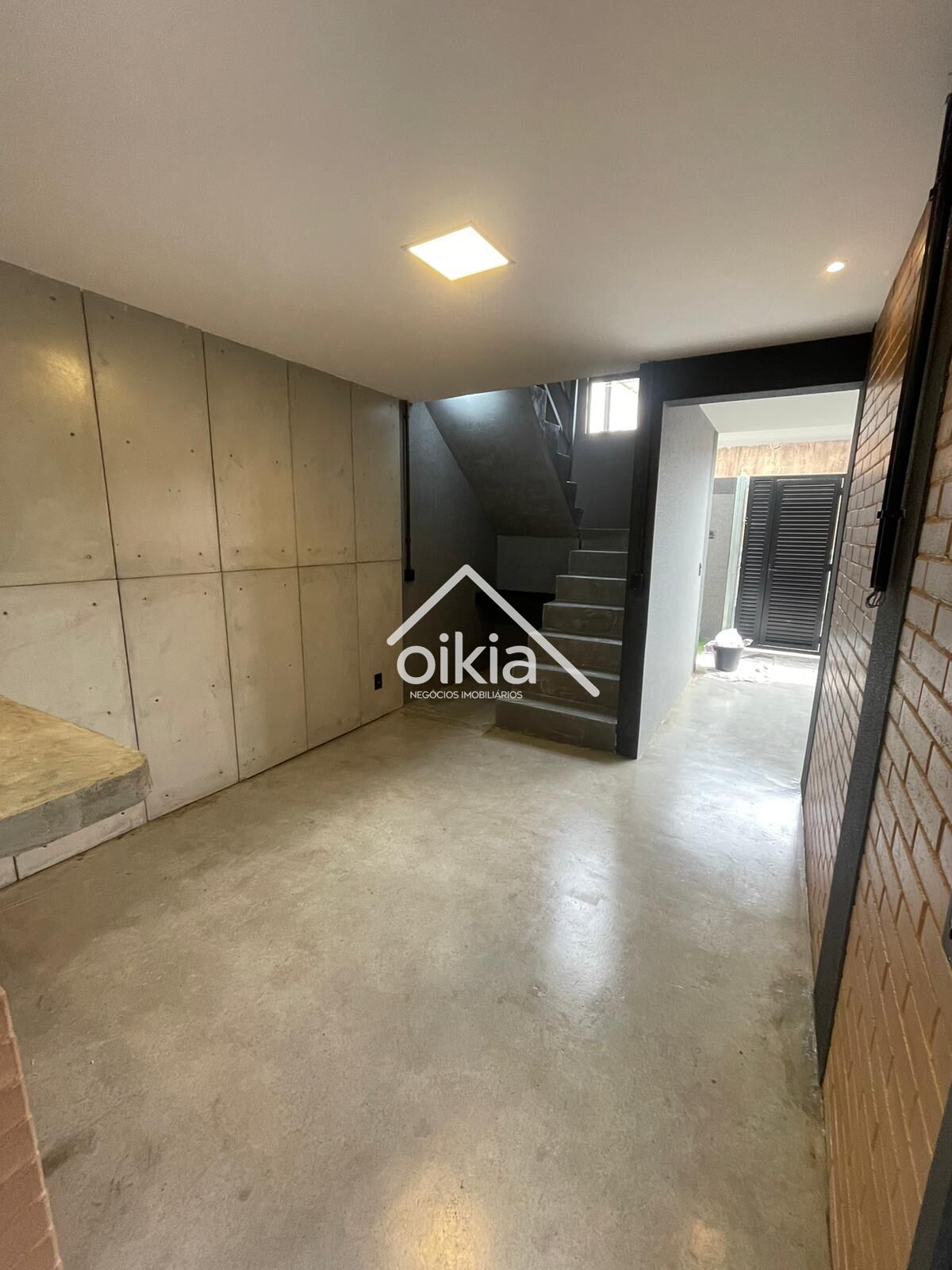 Arquitetura moderna, com paredes em tijolinho ecológico, piso em concreto polido, placas cimenticias de revestimento.